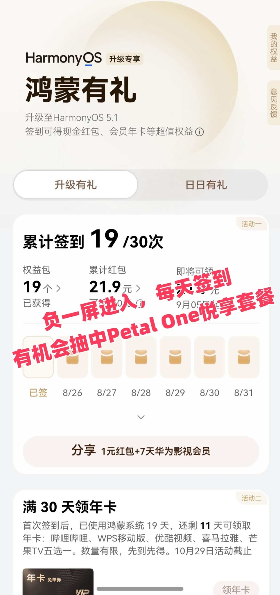 随着我们的“云端保险箱”里面的照片越来越多,免费空间很快就不够用了。正好前阵子我把手机系统升到了鸿蒙5.1,在桌面右滑的负一屏里,惊喜地发现了一个叫“鸿蒙有礼”升级专享的活动。我连着签到了几天,竟然领到了3个月Petal One悦享套餐,里面包含了200GB的云空间会员!这下足够保存我和她这四年每一个珍贵回忆了!