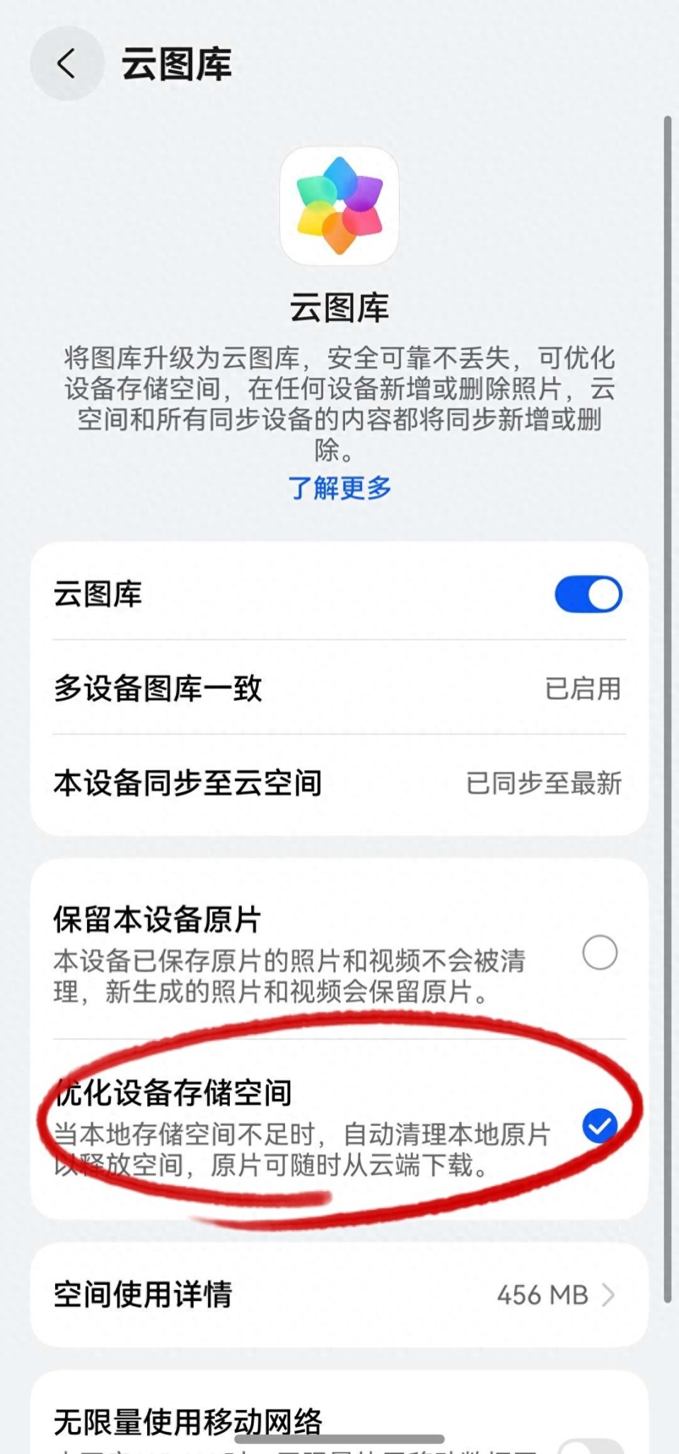 我开启了云图库中的“优化设备存储空间”选项,它就像一个智能管家,不仅可以自动把手机上所有高清原图和视频都安全地上传到云端,在手机空间紧张的时候还能自动将本地中不常用的照片视频替换为小尺寸版本。瞬间,我的手机就多出了几十个GB的可用空间,再也不怕保存照片或视频时,我这边却提示“存储空间不足”的尴尬了。
