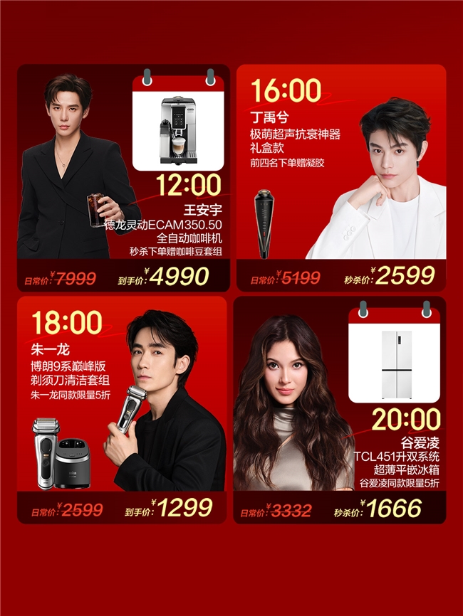 本次超级秒杀日从10月30日0点起,设置多个黄金秒杀时段,不同时段福利不重样,确保消费者能精准锁定心仪商品。比如,早上8点,任嘉伦同款美丽雅密实袋套装率先开抢,购买即附赠专属周边;中午12点,明星王安宇推荐的德龙咖啡机开放秒杀,秒杀价直降上千元,还额外赠送咖啡豆套组,让你在家就能轻松享受专业级咖啡体验。